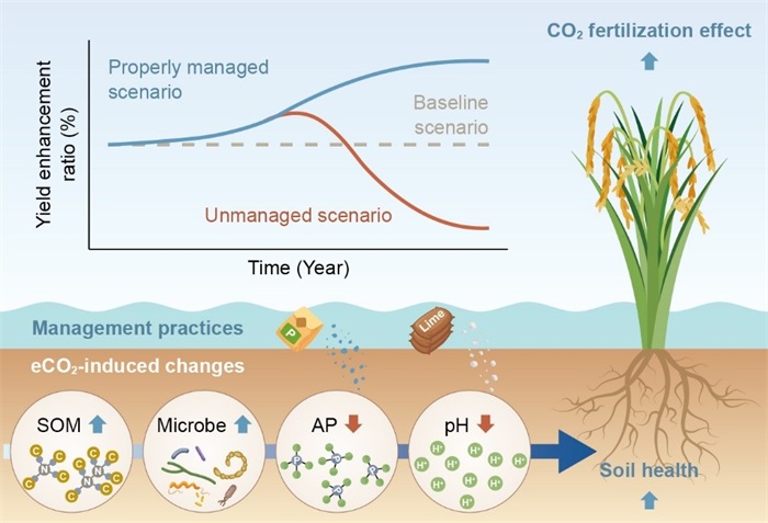 针对这一关键知识空白,中国科学院南京土壤研究所朱春梧研究员课题组构建了适用于中国稻田的土壤健康综合评价体系,并依托全球持续时间最长的两套稻田FACE平台,系统评估了长期大气CO2浓度升高对稻田土壤健康及其生态系统服务功能的影响。研究发现,超过十年的大气CO2升高显著改善了稻田土壤健康情况,同步增强土壤生产力、水质净化与气候调节等功能,有助于水稻CO2施肥效应的长期维持。Meta分析进一步表明,大气CO2升高对土壤健康的改善作用在陆地生态系统中具普遍性,且随暴露年限呈累积效应;然而,非农田系统因氮、磷等关键养分约束,难以维持CO2施肥效应长期稳定。基于上述认识,研究进一步提出:为应对气候风险,须前瞻性缓解土壤磷限制并阻控潜在酸化,以维系大气CO2升高对土壤健康与水稻产量的持续正效应,巩固粮食安全。