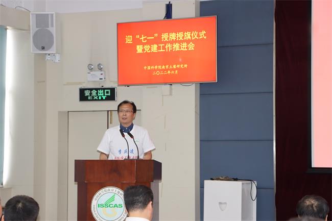 为庆祝中国共产党成立101周年,推动全所干部职工践行科学家精神、建功立业新时代,南京土壤研究所党委于6月29日上午举办迎“七一”授牌授旗仪式。所领导、党委委员、纪委委员、各党支部支委班子成员、“科学家精神教育基地”负责人、各科技攻关突击队队长和骨干代表共计50余人参加授牌授旗仪式。